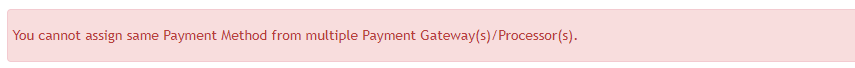 Same payment methods cannot be assigned from multiple Payment gateways, if does so an error message gets displayed. Secondary and Tertiary Payment Gateway/Processor drop-downs are enabled only when the Dynamic Routing Capability is turned ON.